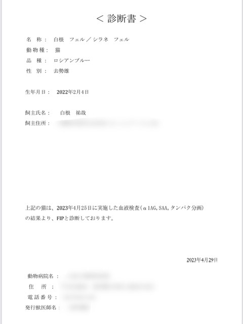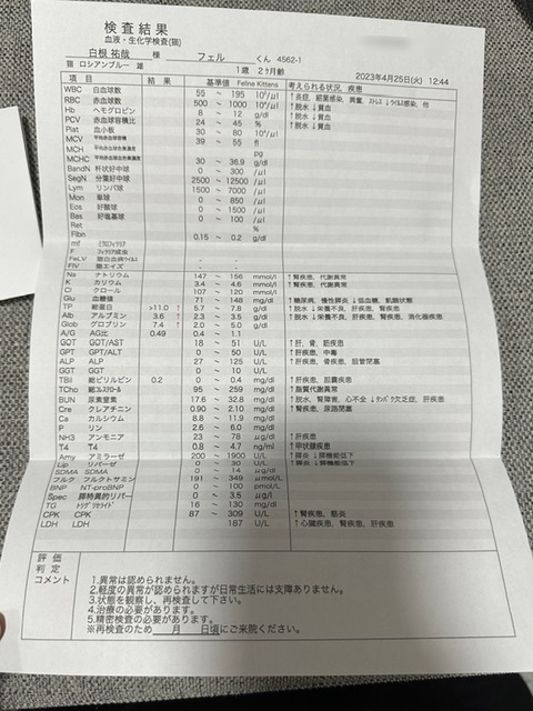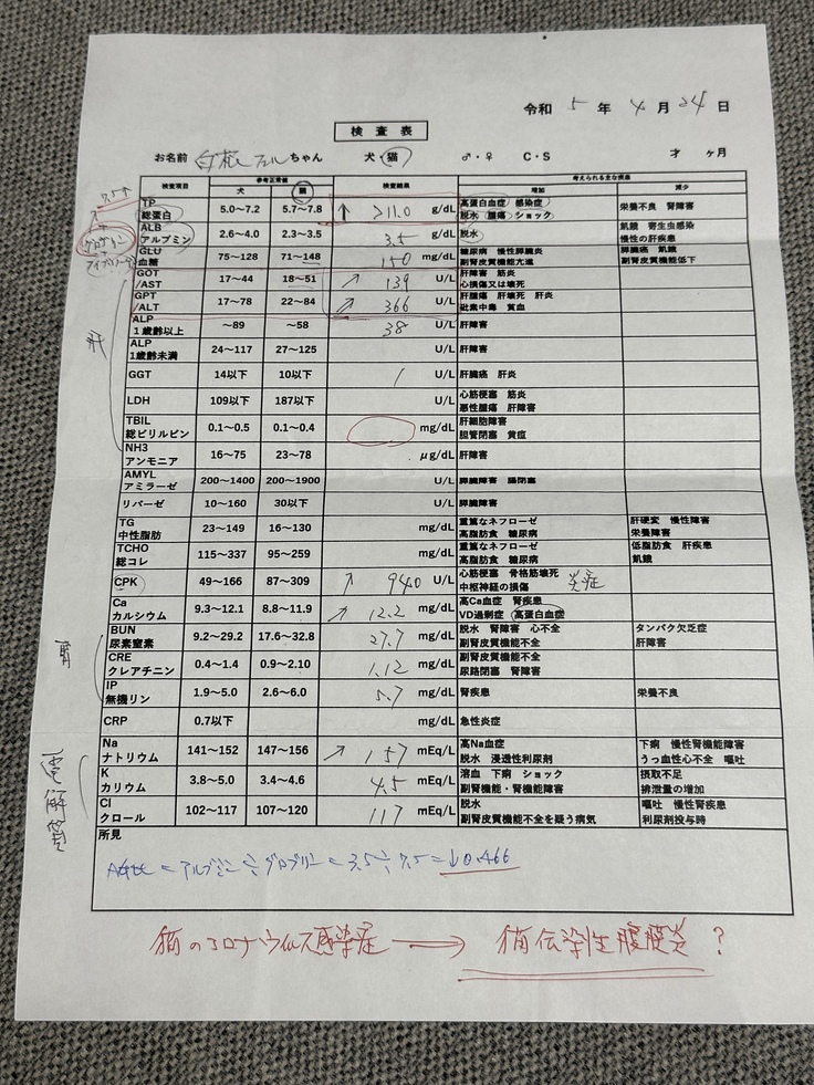 診察室で結果を待ち、告げられた結果はタンパク質の数値が異常に高くFIPの疑いがあるということでした。