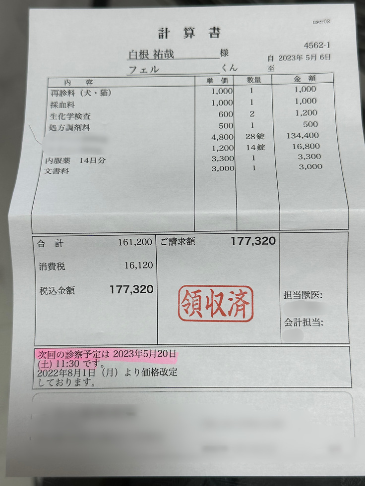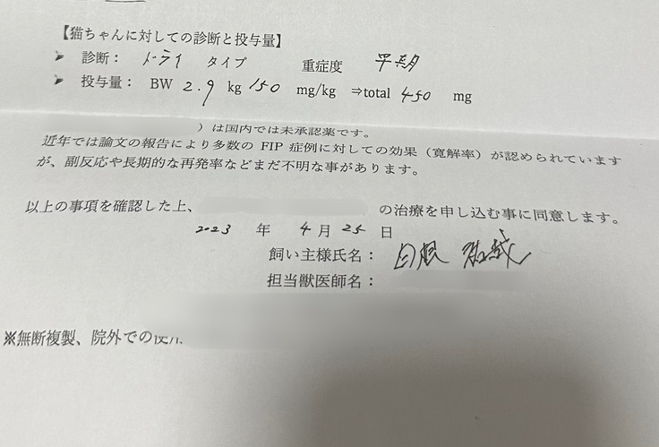 また、頂いた支援金は全てフェルのFIP治療費(薬代、検査費等)に使用します。