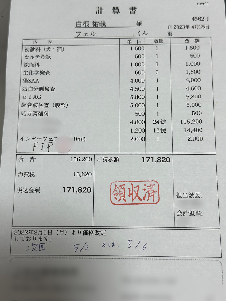 (FIP発症後にかかる検査費診察費は約18万円〜25万円で予定しています。⚠︎ペット保険の回数制限や上限額などにより、保険適応できるかどうかで自己負担額が上下いたします。)