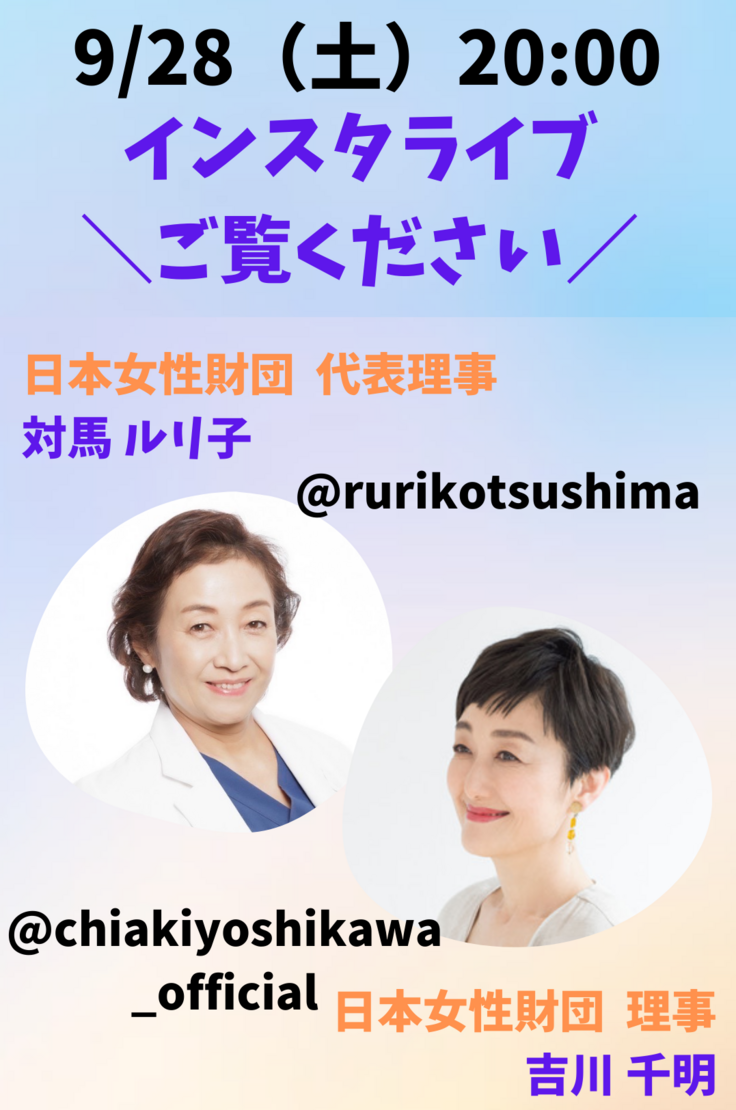 本日夜8時より、代表理事 対馬ルリ子と理事 吉川千明が、これからの女性の健康、生き方について、インスタライブを開催します。