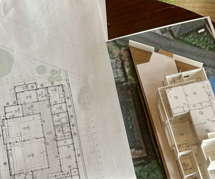 コマドさんに提案いただいた複数の改修プラン案とスタディ模型を見比べて、もとの空間の魅力を最大限に活かした滞在空間のための検討を重ねました。