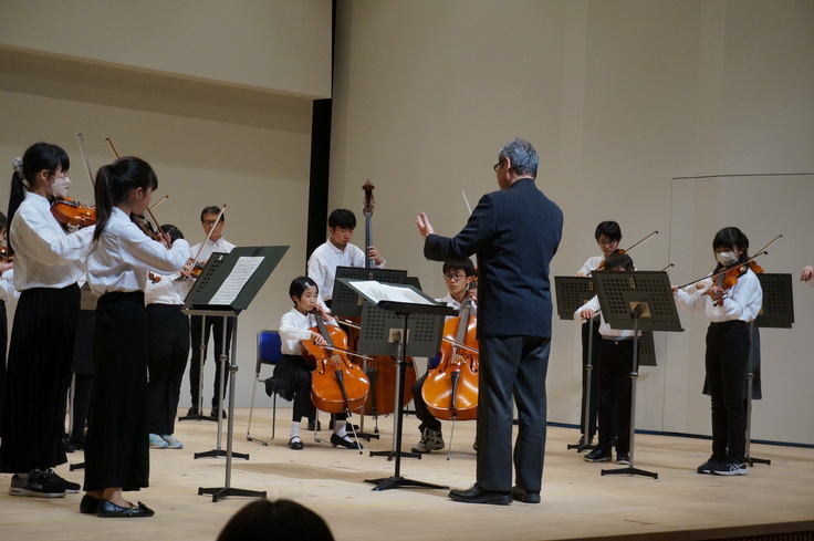 バイオリンを今年始めた小学1年生からこの演奏会で卒業する中学3年生まで、バイオリン、ビオラ、チェロの総勢およそ60人が、全部で14曲を演奏しました。