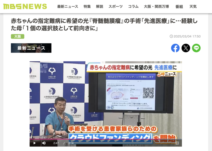 本日(3月4日火曜日)、午前10時半から大阪大学で、脊髄髄膜瘤胎児手術が先進医療として承認されて3月1日から実施可能になったことの報告と、先進医療となった脊髄髄膜瘤胎児手術を受ける妊婦さんとそのご家族をサポートするためのクラウドファンディングを本日から開始することの報告を記者会見でさせていただきました。たくさんの記者の方たちに来ていただき、そして、ニュースに取り上げていただき、本当にありがとうございました。(MBS、NHK 関西 NEWS WEB) 一人でも多くの方々に、脊髄髄膜瘤と診断された赤ちゃんの治療の選択肢の一つとして、この胎児手術があるということを知っていただきたいとともに、この手術を必要とする赤ちゃんとお母さん、お父さん、ご家族に、託された希望のバトンをしっかりと届けたいと大阪大学・成育医療センターのチーム一同、心から願っております。地理的な理由、経済的な理由で、この治療を諦めてほしくない、そういう気持ちでこのクラウドファンディングを始めました。共感していただけましたら、是非、クラウドファンディングにご協力いただき、この手術を必要とする赤ちゃんとお母さん、お父さん、ご家族を、われわれと一緒にサポートしてくださるようよろしくお願い致します。