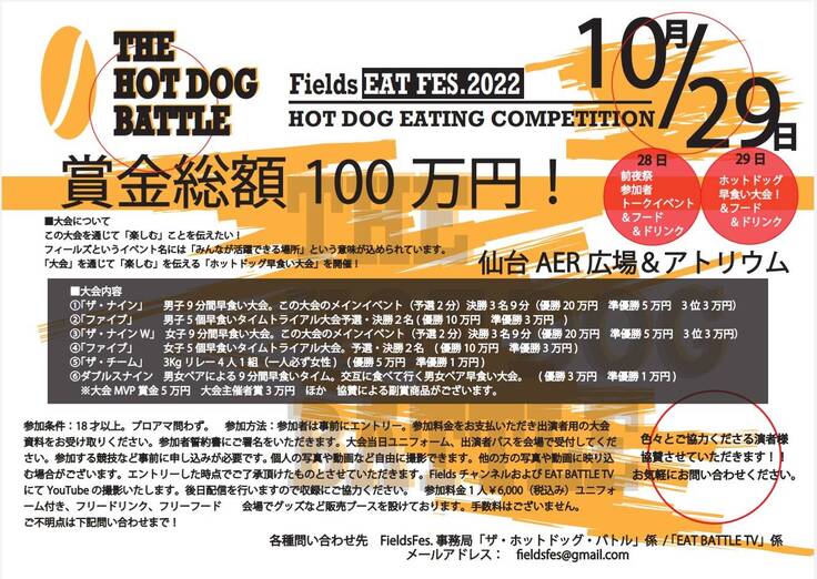 大食いイベントを通じて「楽しむ」ことを伝えたい。「ホットドッグ バトル」にて株式会社yikesmanagementによるスペシャルプログラムを遂行。 クラウドファンディングによる39万円は手数料を除き支援者へのリターンの作成物、プログラム制作、大会に使える布看板やのぼりの設営に使わせていただきます。 10月28日、29日仙台AER広場&1階アトリウムにて開催するイベント「ホットドッグバトル」ののぼりや旗などを制作いたします。