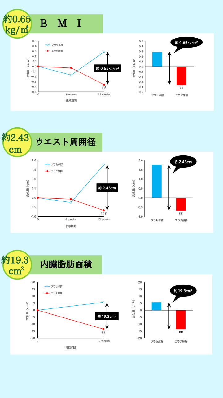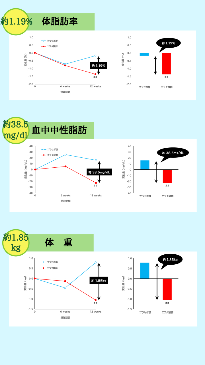 プラセボ群とエラグ酸群を使用して12週間(約3ヶ月間)エラグ酸の研究レビューを行った結果、下記のような有意な低下が認められました!