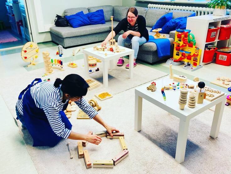 トゥルクの幼稚園訪問の次の日からは、マンネルヘイム児童福祉協会トゥルク支部の「Marakatti」という子育て支援施設の担当の方のご協力のもと、2日間に渡り木のおもちゃのイベント開催が実現しました。こちらの施設では、ベイビーカフェやファミリーカフェといった取り組みをされていて、親子が気軽に来て子育ての悩みを解決したり、色んな情報をコーヒーを飲んだりしながらゆったりと交換することのできる、とても素敵な取り組みをされています。今年2月に訪問して以来、クラウドファンディングでフィンランドへ送ることのできたおもちゃを持っていくことを約束していたので、おかげさまで子どもたちだけでなくお母さんお父さんにも楽しんでもらうことができ、とても嬉しかったです。