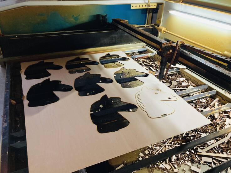 工房では、レーザー加工の機械によってお馬さんの顔がプライウッドから切り取られていました。もしかするとGEPETTOさん史上一番大きい商品かもしれないと思って尋ねてみると、「そうだね!いつも小さいドールハウスを作っているけどこんなに大きい商品はないよ」とおっしゃっていました。人間サイズにするにあたり、木の棒を固定するための小さな工夫やデザインの変更をしてくださっていて、そんなこだわりもイベントではお伝えできたら嬉しいです。