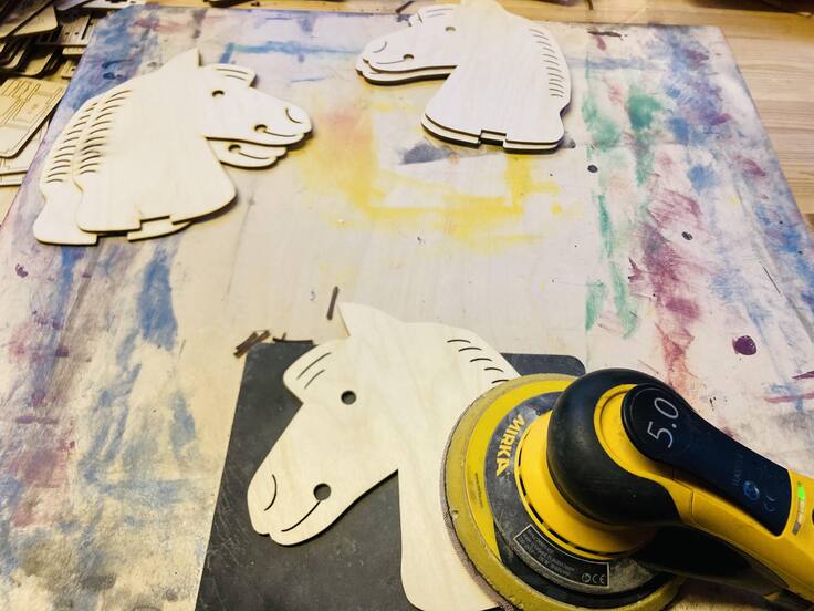 私はお馬さんの顔の表面をなめらかにするために、やすり掛けの工程を手伝わせていただきました。レーザー加工のちょっとした焦げ目をきれいにする作業で、とっても楽しかったです。初めてフィンランドの電動工具メーカーMIRKA(ミルカ)のサンダーを使わせていただきました。粉塵の吸引がしっかりとしていて、木の粉まみれにならずクリーンな環境で作業ができました。