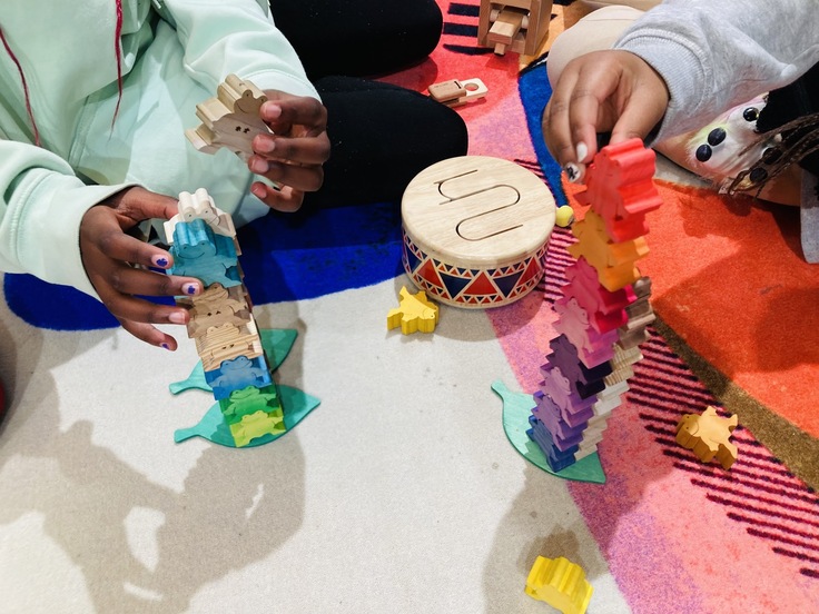アフリカ出身の姉妹は、ふたりで仲良くずーっと閉館まで遊んでいってくれました。私は今まで一度もこの「かえるくん」で遊ぶときに色を気にかけたことがなかったのですが、この姉妹はどんなふうに積み重ねたらきれいな組み合わせになるかを考えながら遊んでいました。このようすを見たときに、とっても感性が豊かだなあと思いました。世の中には色んな基準がありますが、「どうすれば美しくできるか」という基準を私も持っていたいなと思いました。