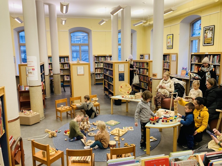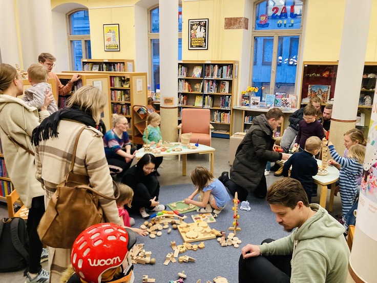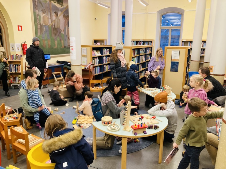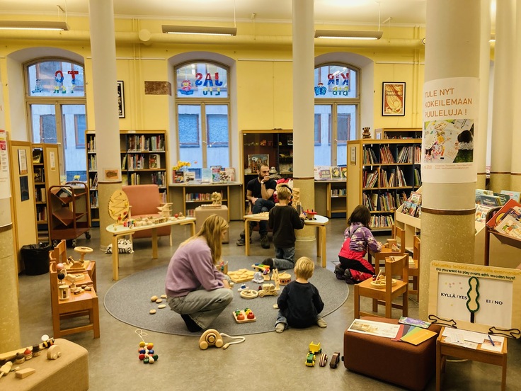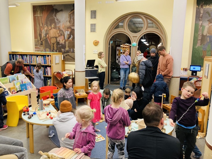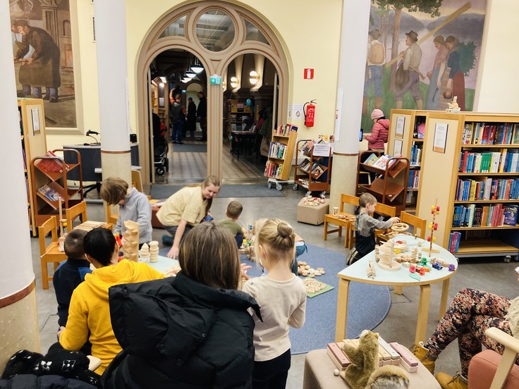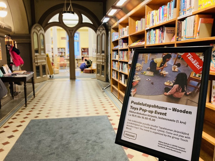 今週の土曜日は、ヘルシンキの古き良き建物が立ち並ぶ市街地にあるリクハルディンカトゥ図書館で木のおもちゃのイベントを行いました。こちらの図書館は、クラウドファンディングのおもちゃが届いてから初めて5月中旬にイベントを開催させていただいていたので、今回で二度目の訪問となりました。1882年からずっと佇んでいる図書館の建物は、いつ来ても居心地が良く、クラシックなインテリアや建物のデザインが、建設当時の時代を想像させてくれます。