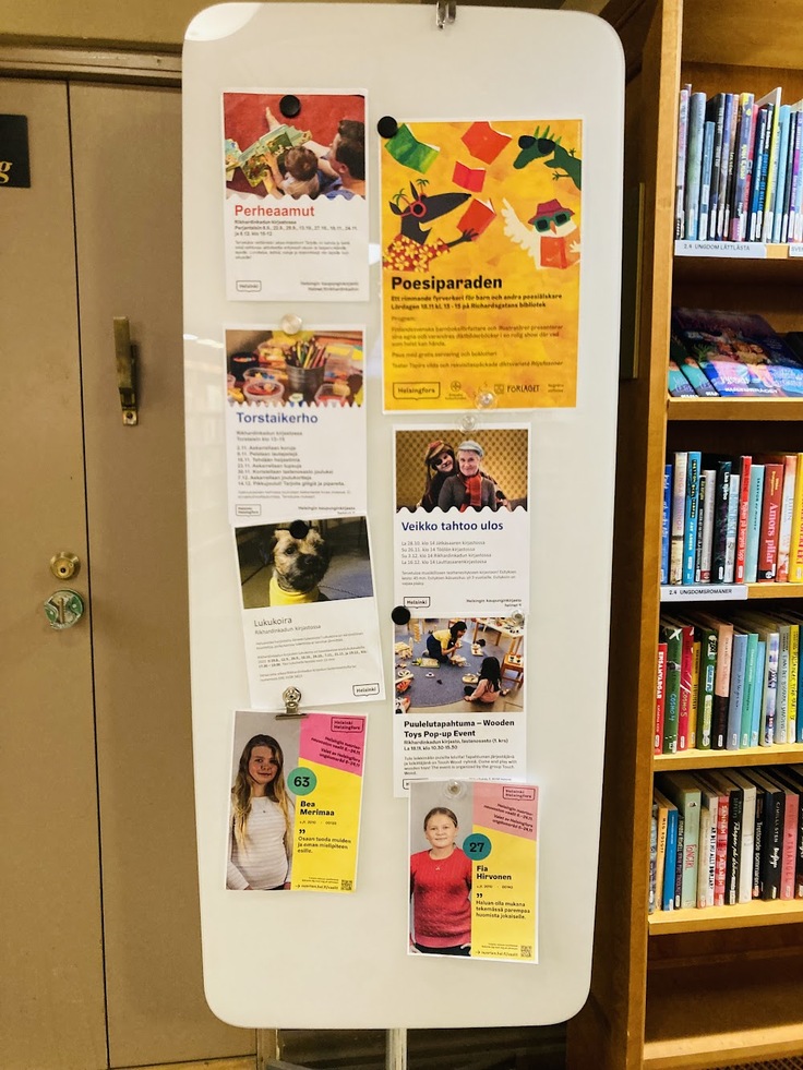 ヘルシンキの図書館はどこに行っても、本を借りて返すだけの場所ではなく、色んな文化やアートに触れたりすることができるので、いつも素晴らしいなあと感動しています。こちらのボードには、私たちのイベントを含めて色んなイベントの告知の紙が貼られていました。