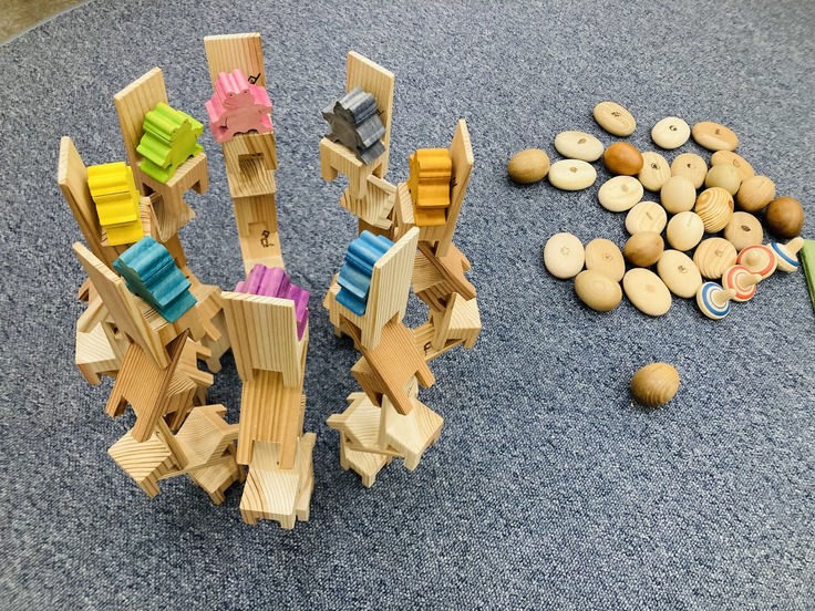 私自身も「てるぺん」という椅子のおもちゃで遊んでいたら、後で「てるぺん」のサークルの上に「かえるくん」たちがやってきて、何やら会議をしているように見えました。この後、サークルが崩れては違う形になったりしていて、その変化の過程を見ているのがとてもおもしろかったです。