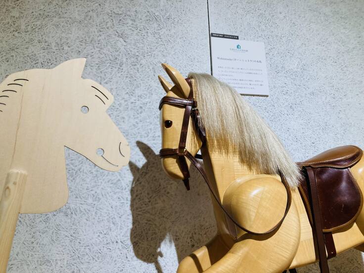 ケッピヘヴォネンは、花巻おもちゃ美術館の入り口で入館者を迎え続けているドイツの木馬「Wohnstuecke(ボーンシュトケ)」のお馬さんにもご挨拶をしてきました。子どもたちを喜ばせ続けるお馬さん同士、積もる話があったみたいです。