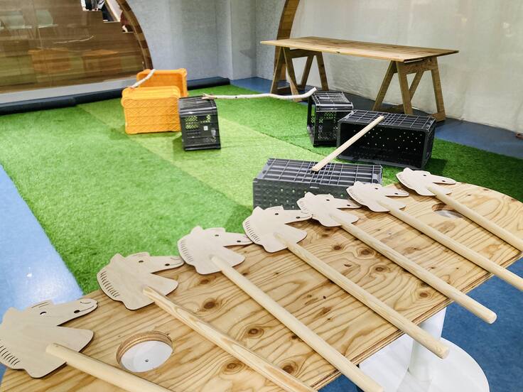 スーツケースに収まる特注のサイズで、ミニチュアドールハウス作家のGEPETTOさんに作っていただいたお馬さんたちのお披露目の日がやって来ました。この日はちょうど絵本の読み聞かせの日で、床にはちょうどお馬さんのフィールドの芝生のような緑が広がっていたので、私はそのままケッピヘヴォネンのワークショップで使わせていただくことになりました。飛び越えられる木の枝を用意して、子どもたちを迎えました。