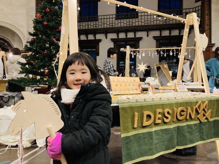 ちなみに、花巻おもちゃ美術館にワークショップでお邪魔する前日は、盛岡の岩手銀行赤レンガ館のクリスマスマーケットに出展させていただいていました。ケッピヘヴォネンは、日本でほしいと思う人がいるかはわからないけど、せっかくだからフィンランドの遊びを紹介するために持っていこうと思って展示テーブルに飾っていたところ、「これなあに?」と話しかけてくれた女の子がいました。乗馬遊びのことを教えられて実際に手に取った瞬間、女の子はすでに人馬一体になっていて、「おうまさんかう!」と心に決めてお母さんにずっと訴えかけていました。お母さんを説得したこの子は、ずっとお馬さんと一緒にクリスマスマーケットを回っていてとても満足そうにニコニコしていました。それを横で見ていたお姉ちゃんも、妹がこんなに楽しそうにしているのを見て、合流したお父さんを説得し、姉妹でケッピヘヴォネンをゲットすることになりました。こんな素敵な笑顔に出会えるなんて、電車や飛行機で運ぶのにいつも幅を取って大変だったけれど、日本まで遥々持って来て本当に良かったと思いました。