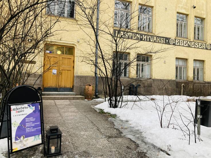 今回は、Touch Woodのメンバーで子育てをしているお母さんたちから教えてもらった子どもたちの遊び場を見学してきたので、そのようすをお伝えしたいと思います。ヘルシンキのSörnäinenというメトロの駅のすぐそばにある「幼稚園博物館(Lastentarhamuseo)」です。博物館が入っているEbeneser-taloというこの建物は、幼稚園や児童養護施設のためのスペースを備えた建物として1908年に完成したので、外壁にも子どもたちが豊かに成長するようすがレリーフとして刻まれています。館内は、フィンランドの幼稚園や幼児教育の歴史を遊びながら学べる施設になっています。