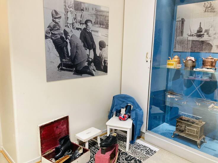 1階のもうひとつの部屋には、白黒の当時の写真と共に当時幼稚園で使われていたテーブルや椅子、おもちゃなどが展示されていました。