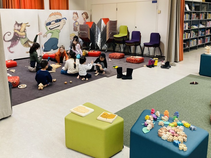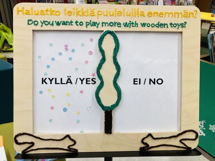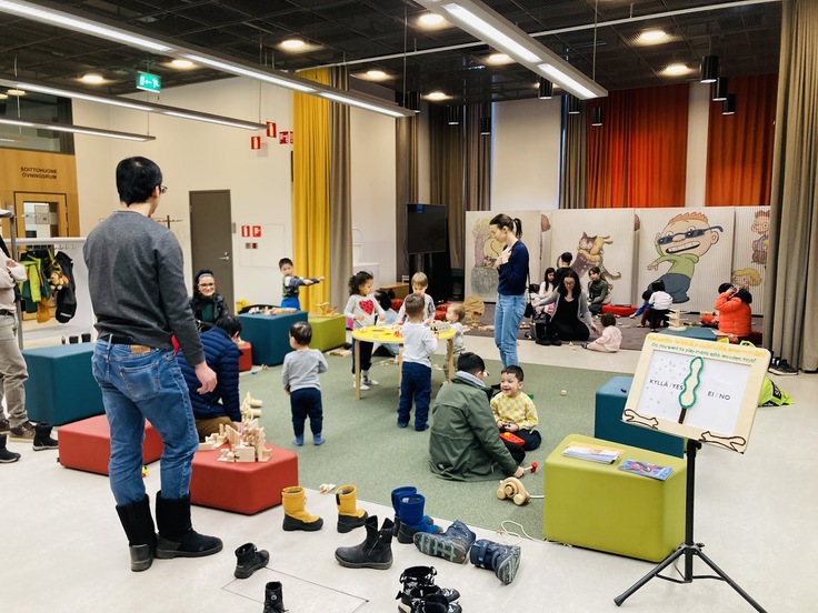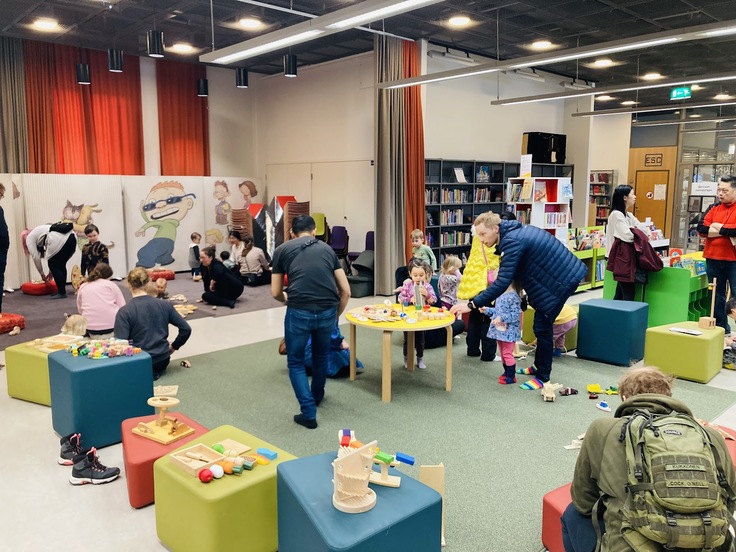 イースター休暇前の土曜日は、ヘルシンキの隣のエスポーにあるセッロ図書館で木のおもちゃのイベントを行いました。こちらの図書館は、駅構内の大きなショッピングセンターに隣接されていて、子どもの本のセクションだけで1階を占め、2階には大人向けの本があり、その大きさにただただ驚きました。本がぎっしり詰まっているというよりは、一人ひとりがのんびり本を楽しめる空間が広がっている印象がありました。