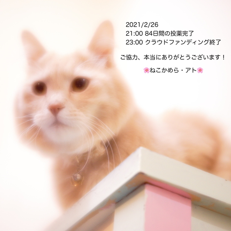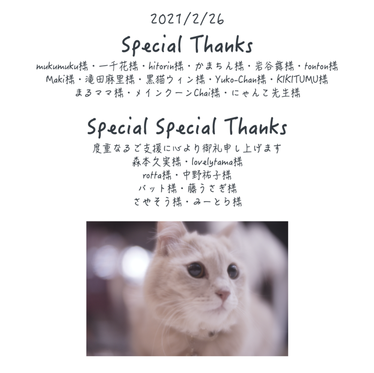 前回のご報告以降新たにご支援いただきましたかまちん様、岩谷舞様、tonton様、Maki様、滝田麻里様、黒猫ウィン様、Yuko-Chan様、KIKITUMU様、まるママ様、メインクーンChai様、にゃんこ先生様には、改めて心より感謝申し上げます。