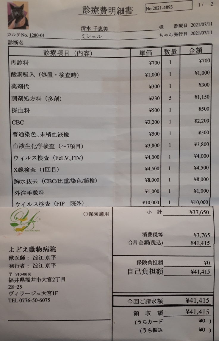 7月11日 診察 検査 診断 胸水除去等 41.415円