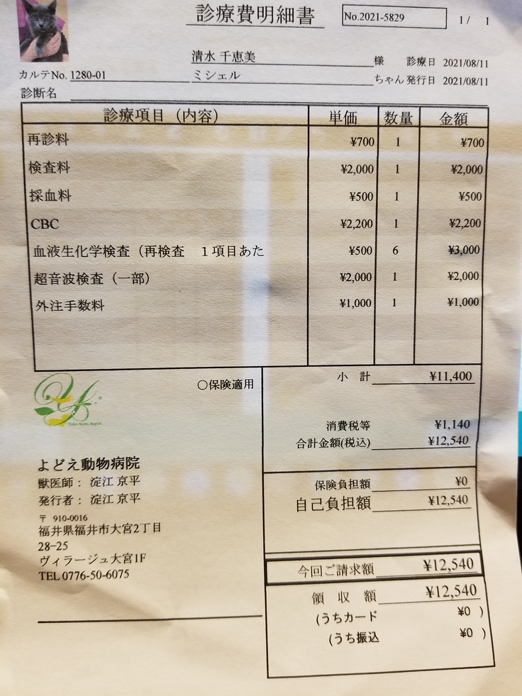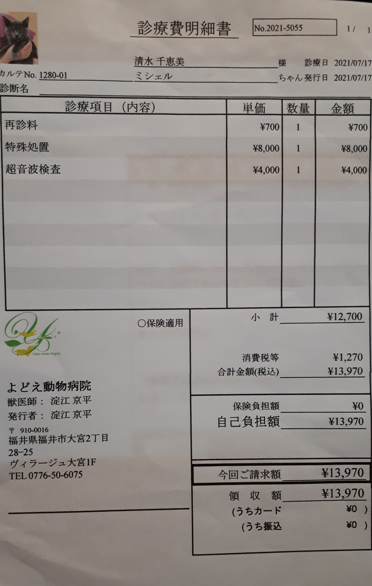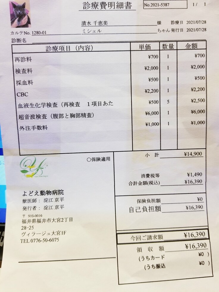 7月28日 診察 血液検査 超音波検査等 16.390円