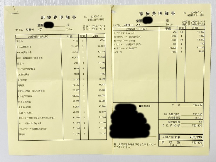 ノアは元々病気がちな子だったのでFIPを発症する前から治療費で何十万とかかっています。