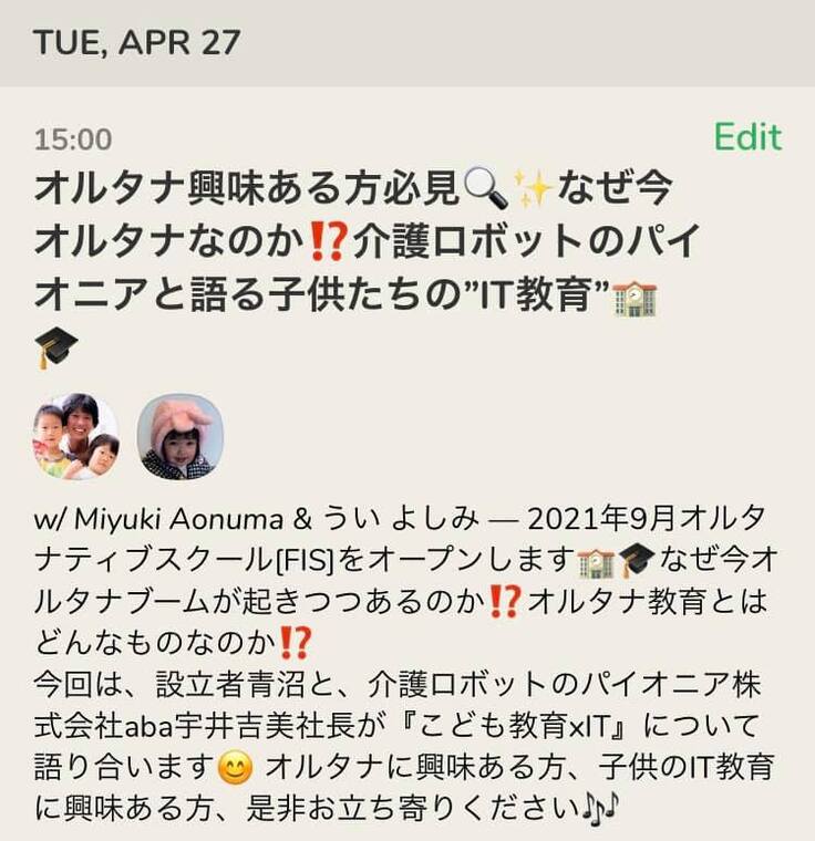 先週の池川明先生とのclubhouseに引き続き、今回は、介護ロボットのパイオニア、株式会社abaの宇井吉美社長をお迎えして『子供たちのIT教育』について語り合います♪