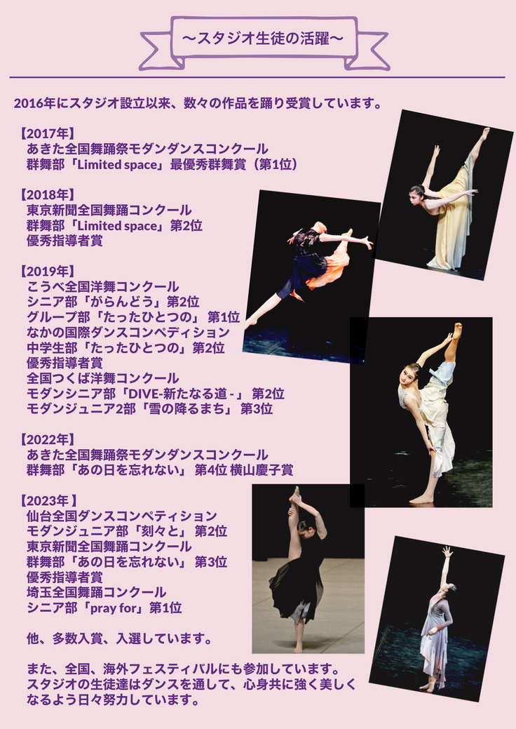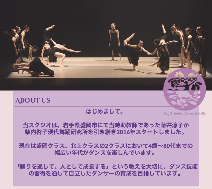 藤井淳子ダンススタジオは、2016年岩手県盛岡市にてモダンダンス、コンテンポラリーダンスを学べるスタジオとして柴内啓子現代舞踊研究所を引き継ぎ、藤井淳子が主宰となりスタートしました。現在は3歳〜80代までの幅広い年代がダンスを楽しんでいます。 「踊りを通して、人として成長する」の教えを大切に、ダンス技術の習得を通じて、自立したダンサーの育成を目指しています。 私達はそんな藤井淳子先生の才能、指導力、そして何より素晴らしい作品に魅了され、保護者およびOGによって発足した後援会組織です。少しでもスタジオを支えられるようサポートさせていただいております。
