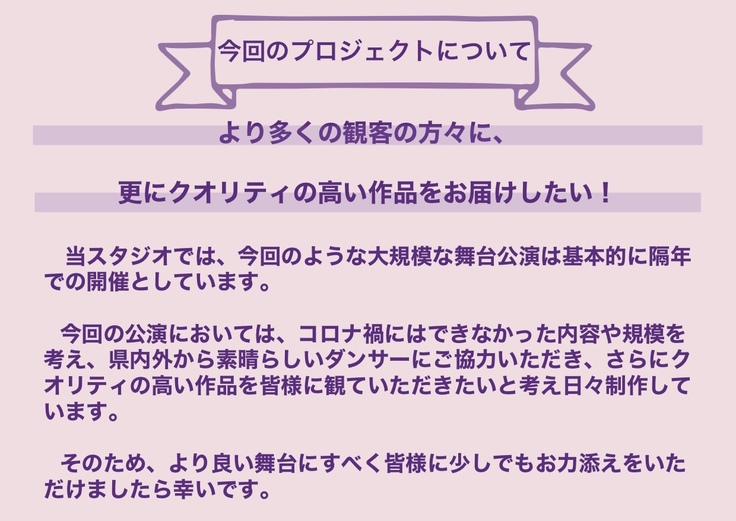 このたび、11月に行われる「第76回岩手芸術祭 藤井淳子ダンスタジオ ダンス公演2023」における単独公演に際し、当スタジオの作品をよりクオリティを高め、多くの方々に観ていただき、喜んでいただけるようにと考えております。