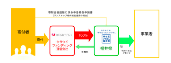 そのため、このプロジェクトに対する個人による寄附はふるさと納税の対象となり、ご寄附頂いた額に応じて、個人住民税等から一部が控除されます。(企業版ふるさと納税の対象ではないため、法人による寄附はふるさと納税の対象となりません。) 寄附金は福井県がふるさと納税として領収し、その寄附金から寄附代行手数料を除いた額を、奨励金として事業者に支給します。