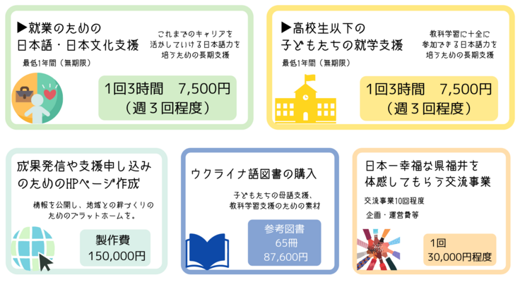 当初の目標金額に加え、頂いたご支援は、日本語学習支援・生活支援などの中長期支援に。また、ホームページ制作や交流事業等を通して避難民の方と福井に住む外国人の方を含め多くの方との絆が生まれる瞬間を創るために大切に活用させていただきたいと考えております。仮にネクストゴールの金額を達成できなかった場合も、頂いたご支援については、ウクライナ避難民の方の自立支援として大切に活用させて頂きます。