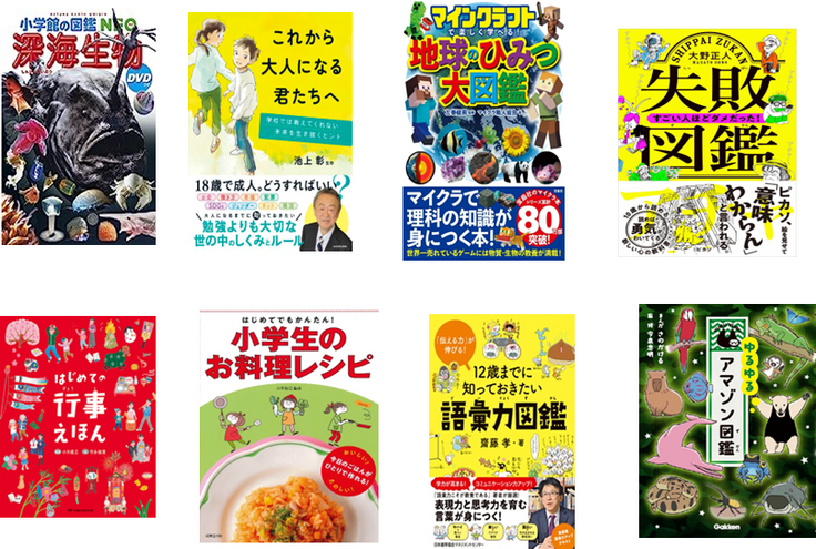 小学館の図鑑NEOシリーズ、がっこうのおばけずかんシリーズ、マインクラフトの学習シリーズなど子どもがわくわくするような本、語彙力の本や実験の本など親子でも楽しめる本など読むのが楽しみになるような本ばかりです。