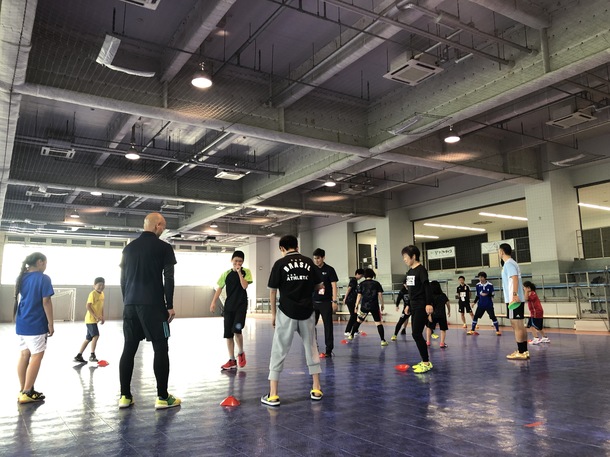 デフフットサル日本代表の船越選手にお越しいただき、音のない世界でのフットサルの体験会を開催しました。耳栓を付けて声を出すのは禁止というルールで、独特な練習メニューとゲームを実施しました。はじめは普段との違いに戸惑いもありましたが、笑顔が多く、聴覚障害への理解も深まる機会となりました。