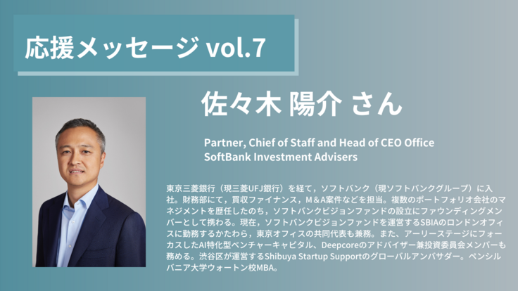 本日は佐々木陽介さんです!ソフトバンク・ビジョンファンドのCEOオフィス長として、世界中のスタートアップ企業の投資のまさに第一線を見てこられてきた方です。
