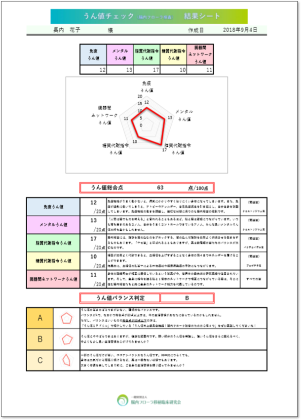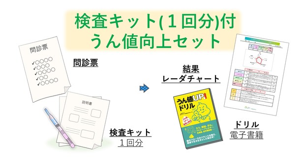 ご自宅で簡単にできる腸内フローラ検査。検査後、世界初・腸内細菌の働きにアプローチした解析法によるレーダーグラフと、腸内フローラバランスUPのための「うん値UPドリル」が届きます。