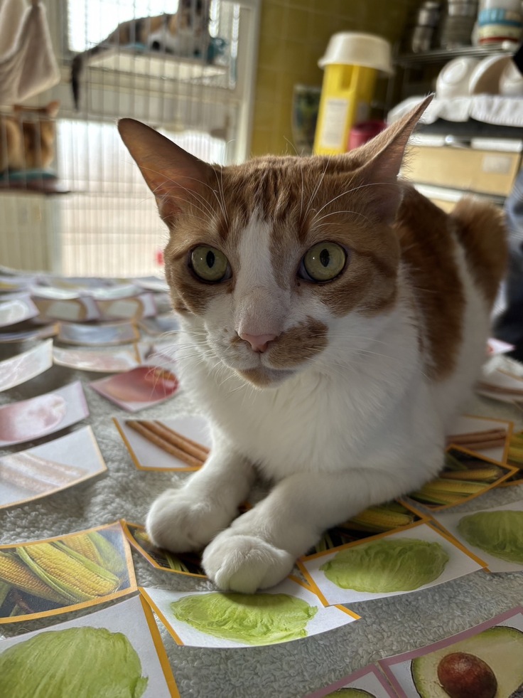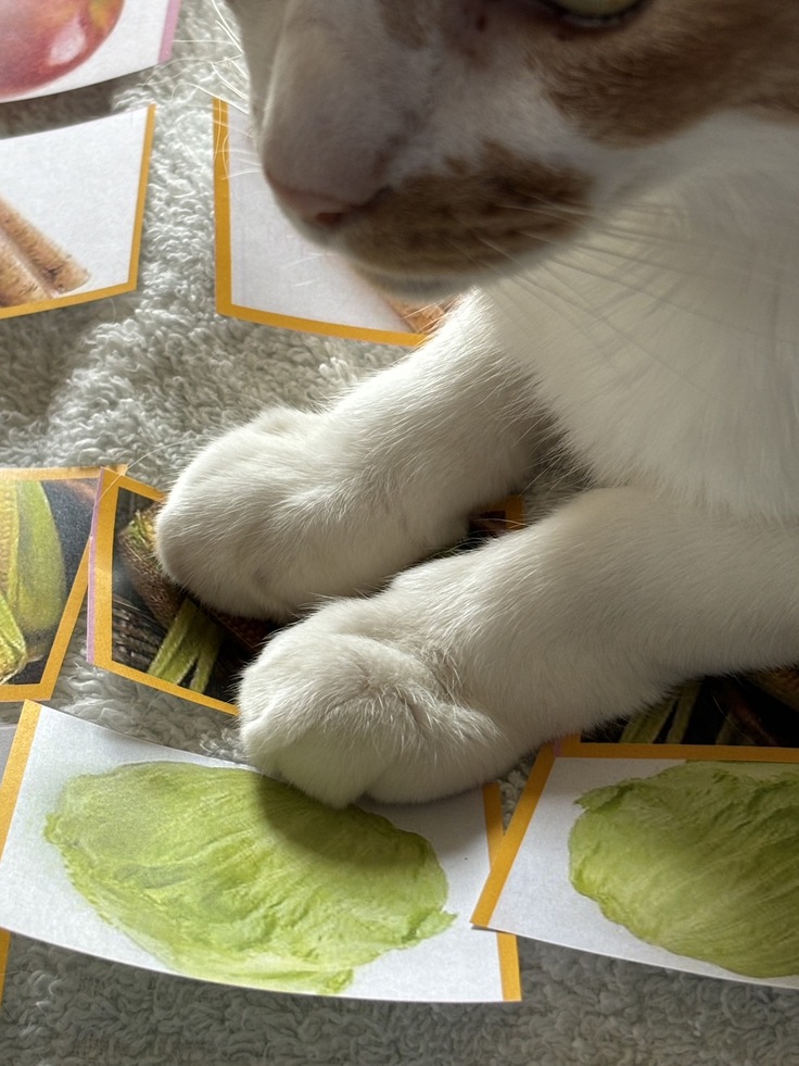 前回のクッキーカルタの難易度を上げて、今回は野菜を使ったゲームにオーラも参戦🐈