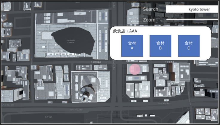 独自アプリケーションに表示される、3D Map上の飲食店をクリックすると、