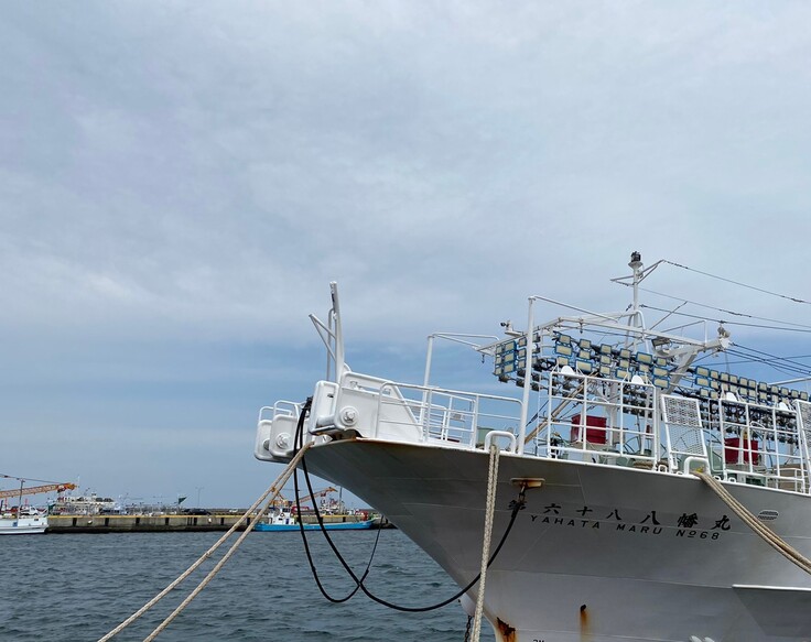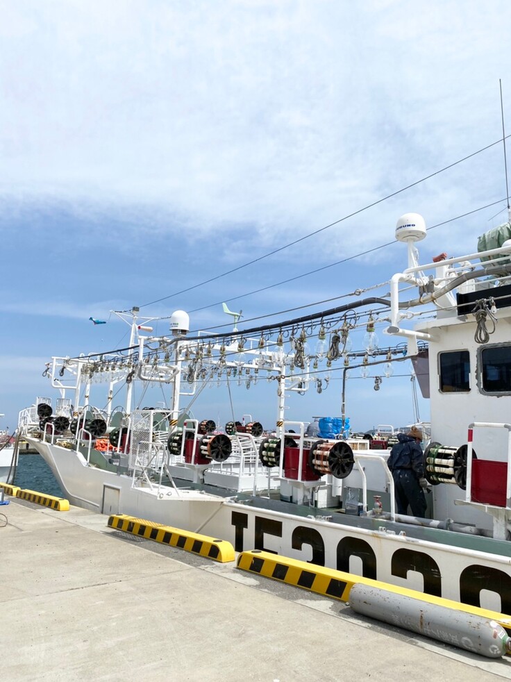 近年、海洋環境の変動の影響によって水揚げ減、コロナの影響で販売減少し、苦戦している地元の中型イカ釣り漁船。