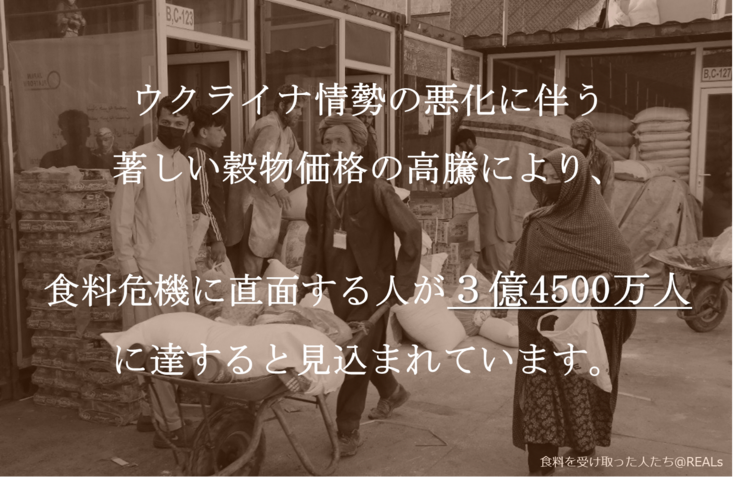 国連世界食糧計画(WFP)の報告によると、ウクライナ情勢悪化の影響により、深刻な食料危機に直面している人々の数は、2022年初の2億7600万人から過去最高となる3億4500万人へと急増することが見込まれています※1。