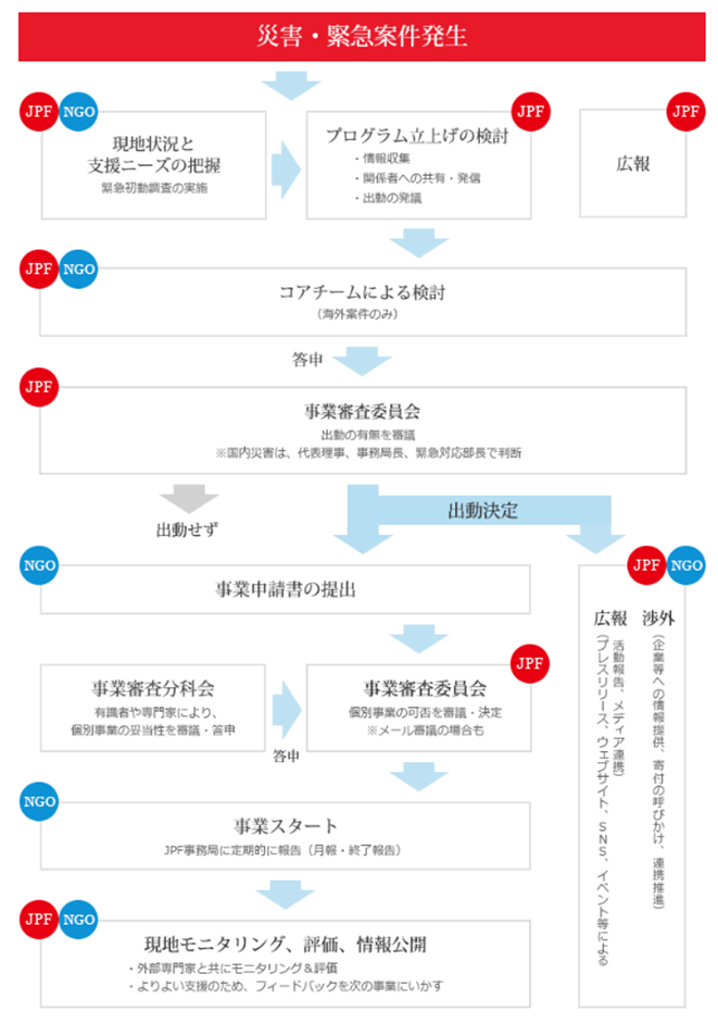 JPF is an international emergency humanitarian aid organization which offers the most effective and prompt emergency aid in response to global developments, focusing on issues of refugees and natural disasters. JPF conducts such aid through a tripartite cooperation system where NGOs, business communities, and the government of Japan work in close cooperation, based on equal partnership, and making the most of the respective sectors’ characteristics and resources.