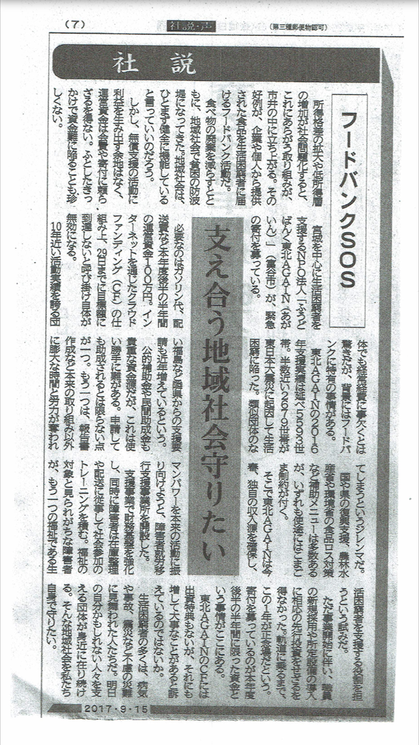 本日、NPO法人 ふうどばんく東北AGAINが河北新報様の社説に掲載されました!