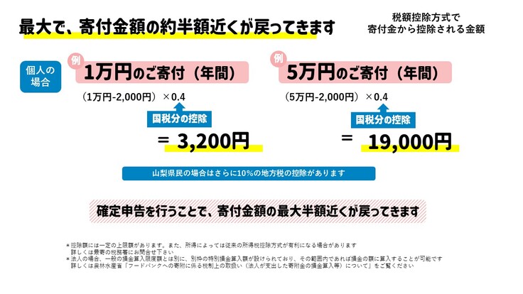 フードバンク山梨へのご寄付は、特定公益増進法人への寄付金として、所得税・相続税・法人税の税制上の優遇措置があります。
