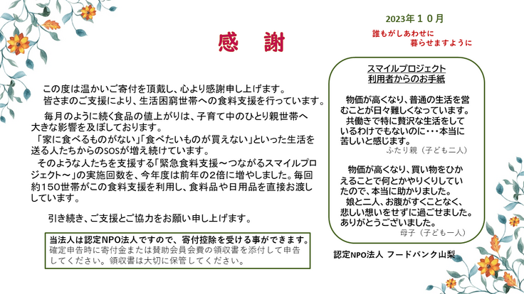 ・寄付金領収書(毎年1月に合算領収書を郵送)