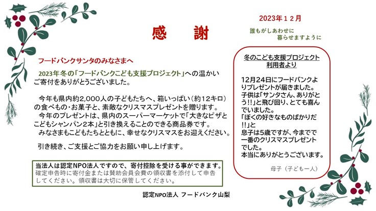 困窮世帯で暮らす子どもたちが、しあわせなクリスマスを迎えることができるよう願っています。