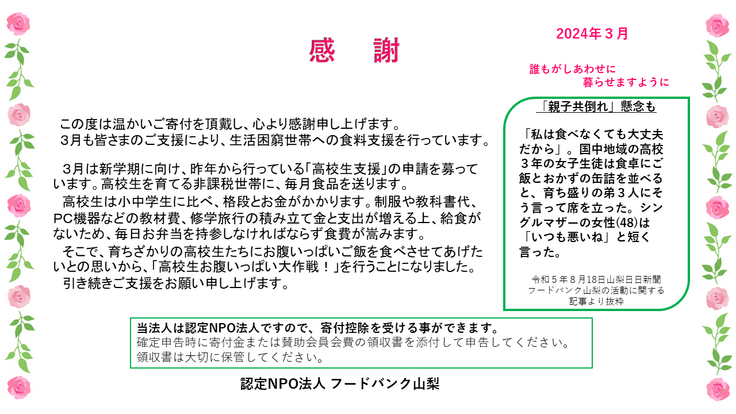 2023年よりフードバンク山梨では高校生への食料支援を始めました。
