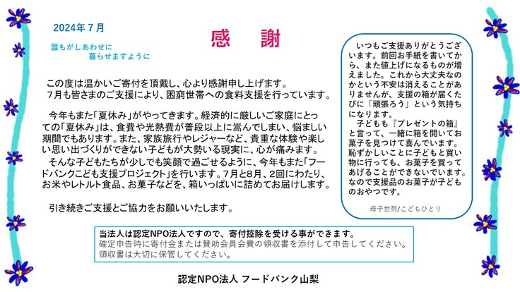 ・寄付金領収書(毎年1月に合算領収書を郵送)