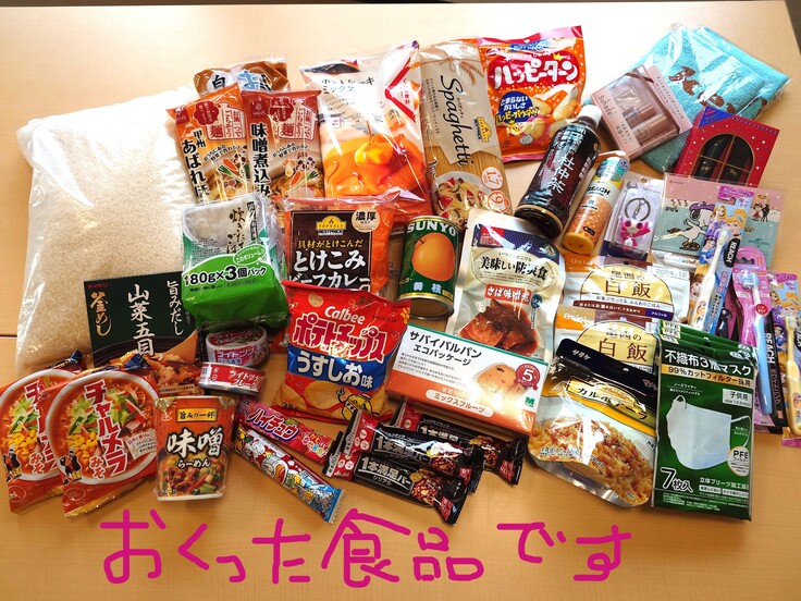 箱の中身は、5kgのお米とたくさんの食品、お菓子や文房具、歯ブラシや化粧品などです。