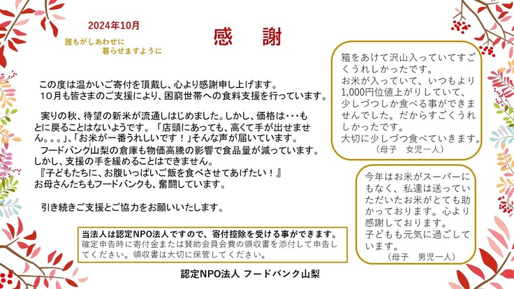 10月の寄付者さまへのお礼のお手紙をご覧ください。