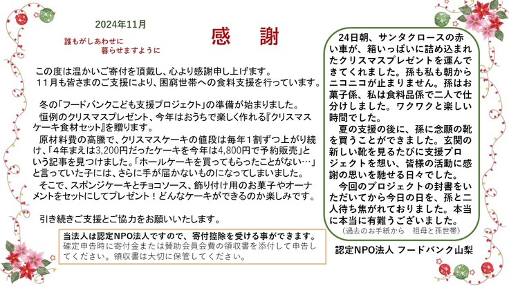11月の寄付者さまへお礼のお手紙