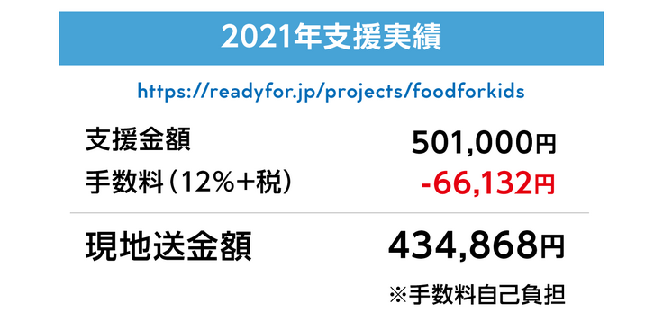 ※手数料や事務経費は別事業の収益や、活動全般への寄付より支出しています。毎月のご支援会員も募集しています(詳細はこちら)